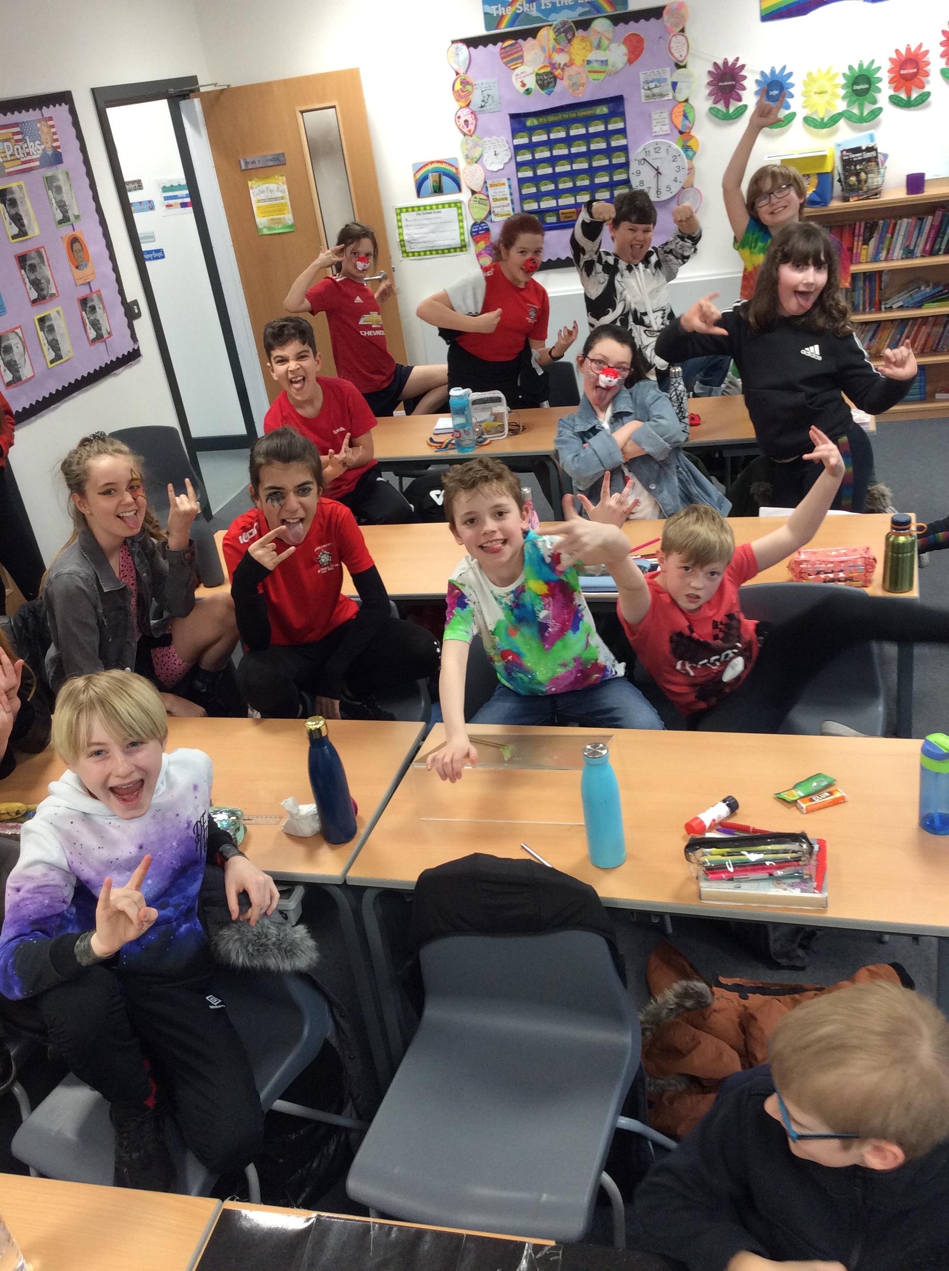 19.03.2021 - Today in school we celebrated Red Nose Day to raise money for Comic Relief. All week, we have been participating in a whole school TT Rockstars battle, so today we came dressed as rockstars and wore red to support Comic Relief. Here are some of our fantastic outfits!